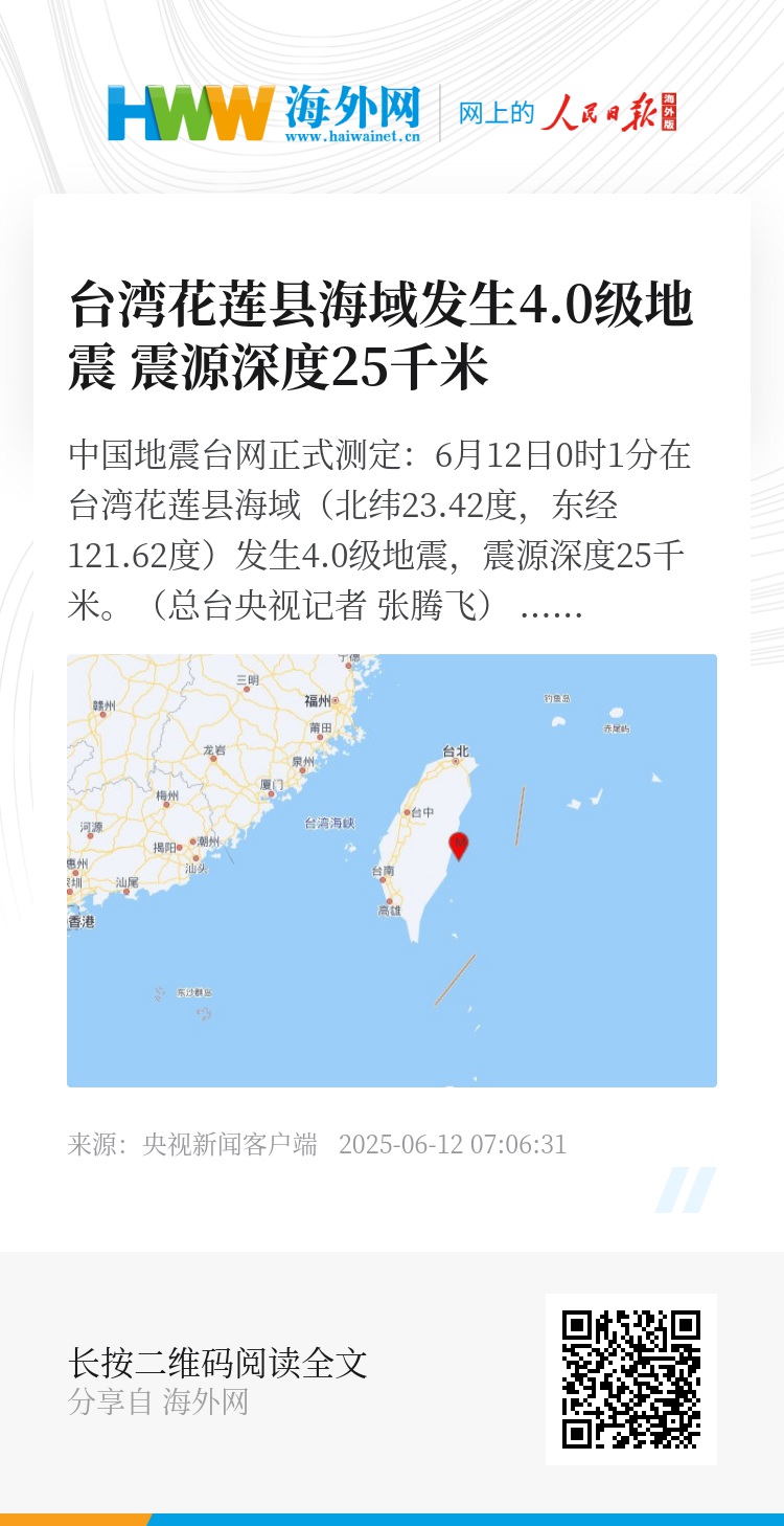 中国地震台网正式测定:6月12日0时1分在台湾花莲县海域(北纬23.42度,东经121.62度)发生4.0级地震,震源深度25千米。(总台央视记者 张腾飞)