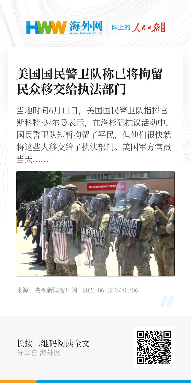 当地时间6月11日,美国国民警卫队指挥官斯科特·谢尔曼表示,在洛杉矶抗议活动中,国民警卫队短暂拘留了平民,但他们很快就将这些人移交给了执法部门。