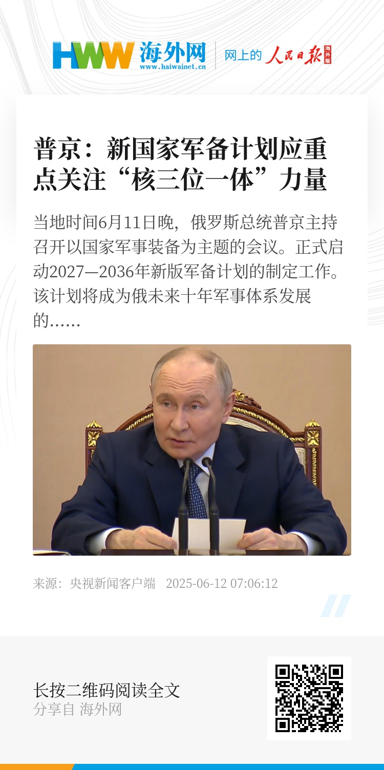 当地时间6月11日晚,俄罗斯总统普京主持召开以国家军事装备为主题的会议。正式启动2027—2036年新版军备计划的制定工作。该计划将成为俄未来十年军事体系发展的纲领性文件。
