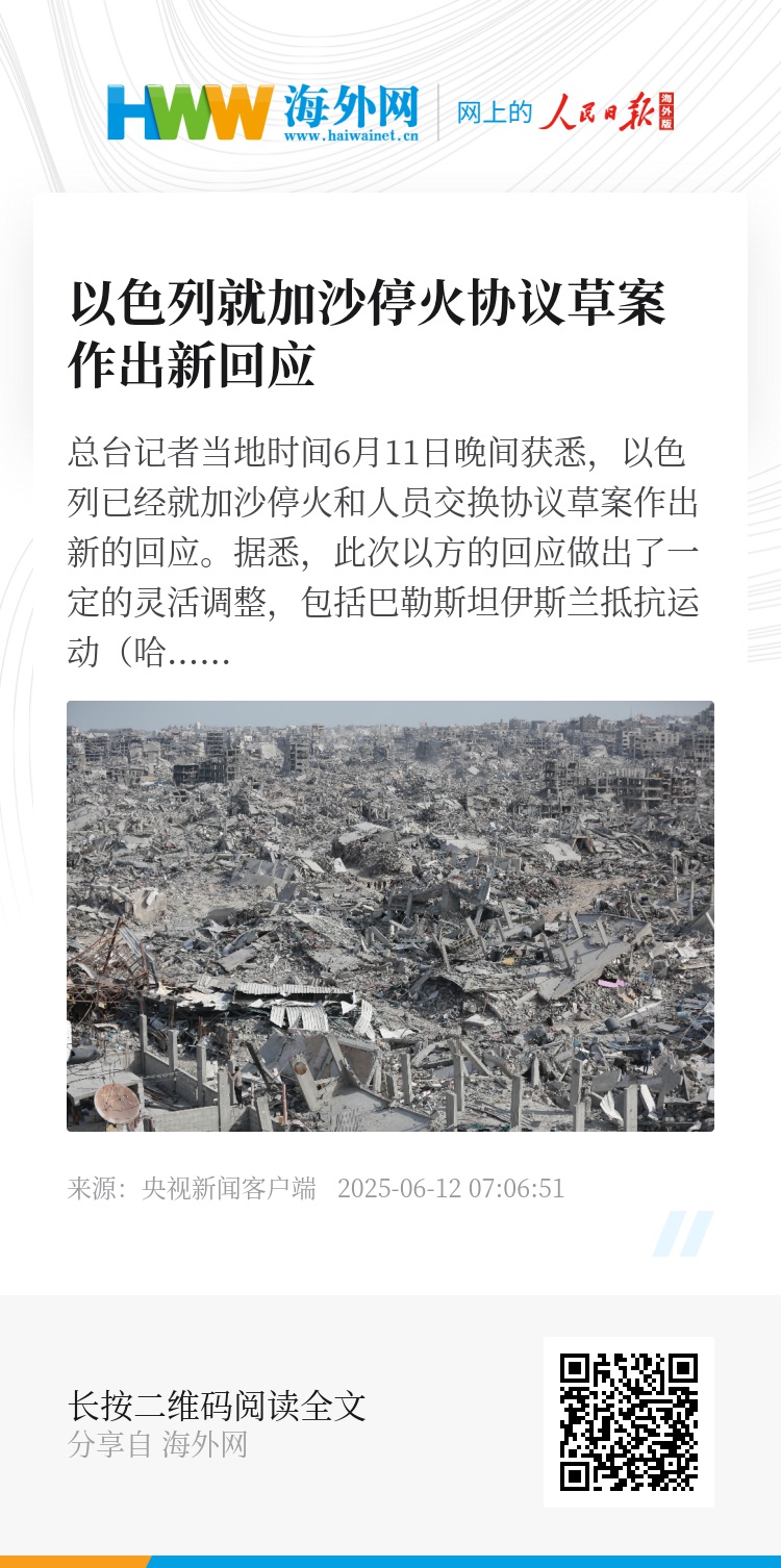 总台记者当地时间6月11日晚间获悉,以色列已经就加沙停火和人员交换协议草案作出新的回应。