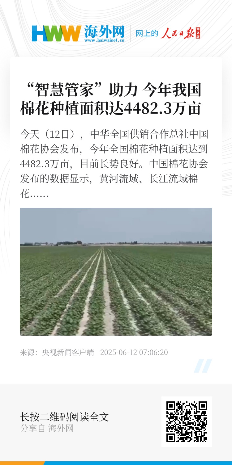 今天(12日),中华全国供销合作总社中国棉花协会发布,今年全国棉花种植面积达到4482.3万亩,目前长势良好。