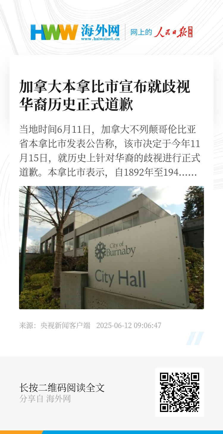 当地时间6月11日,加拿大不列颠哥伦比亚省本拿比市发表公告称,该市决定于今年11月15日,就历史上针对华裔的歧视进行正式道歉。