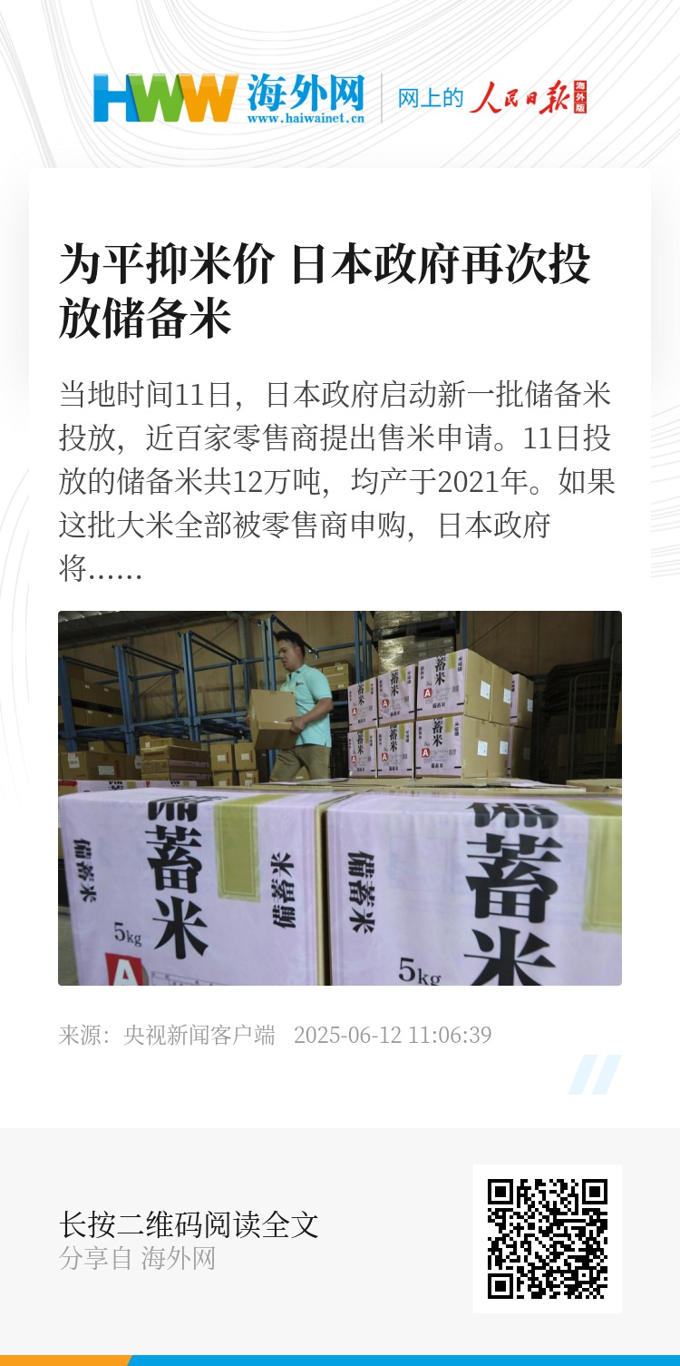 2024年夏季以来,受极端高温致大米歉收等因素影响,日本大米价格持续上涨。为平抑米价,日本农林水产省从3月开始向市场投放储备米,先前已投放4批。连日来,已投放储备米在日本多地陆续上市,引发民众抢购,鹿儿岛县和广岛县等地甚至出现千人大排长龙、彻夜等待的情况,被媒体称为“大米争夺战”。
