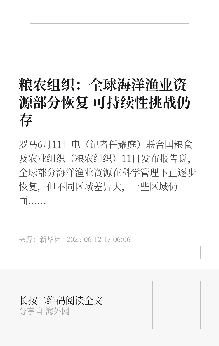 新华社罗马6月11日电(记者任耀庭)联合国粮食及农业组织(粮农组织)11日发布报告说,全球部分海洋渔业资源在科学管理下正逐步恢复,但不同区域差异大,一些区域仍面临过度捕捞等可持续性挑战。报告呼吁各国加强治理,推广有效经验,推动海洋渔业可持续发展。