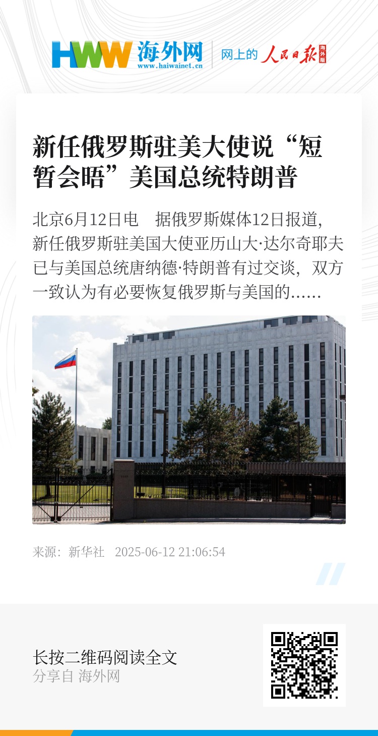新华社北京6月12日电 据俄罗斯媒体12日报道,新任俄罗斯驻美国大使亚历山大·达尔奇耶夫已与美国总统唐纳德·特朗普有过交谈,双方一致认为有必要恢复俄罗斯与美国的关系。