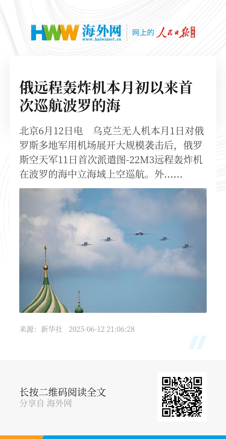 新华社北京6月12日电 乌克兰无人机本月1日对俄罗斯多地军用机场展开大规模袭击后,俄罗斯空天军11日首次派遣图-22M3远程轰炸机在波罗的海中立海域上空巡航。外媒分析,俄方似乎有意借此驳斥乌方“夸大战果”,释放俄军行动“一切照旧”的信号。