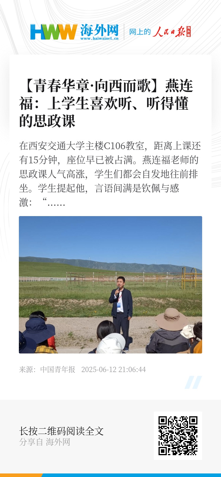“‘照本宣科’的教学模式已无法满足学生需求,思政课要有生活温度,也要有世界的广度。”燕连福说。他常常带领学生把课堂搬进革命纪念馆、企业生产一线、广袤农村,让文物史料、发展成就成为鲜活教材。同时他常以多语种慕课为纽带,向世界传递中国理论,真正实现了“教室小课堂”到“中外大课堂”的跨越。