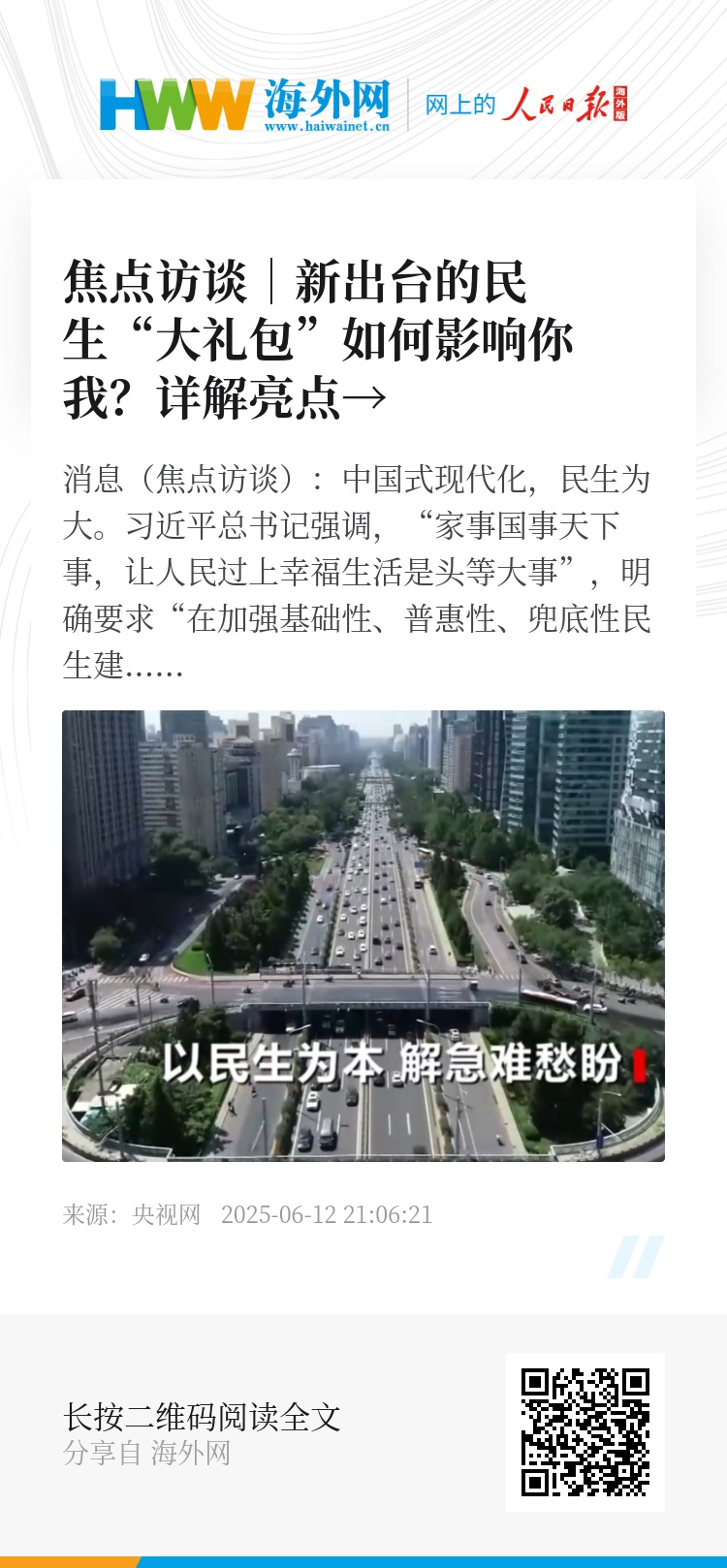 央视网消息(焦点访谈):中国式现代化,民生为大。习近平总书记强调,“家事国事天下事,让人民过上幸福生活是头等大事”,明确要求“在加强基础性、普惠性、兜底性民生建设和解决群众急难愁盼问题上多办实事”。6月9日,中办、国办印发《关于进一步保障和改善民生 着力解决群众急难愁盼的意见》(以下简称《意见》),从人们关心的社会保障、医疗、教育、养老等方面,进一步保障和改善民生,着力解决群众急难愁盼,推动民生建设更加公平、均衡、普惠、可及。