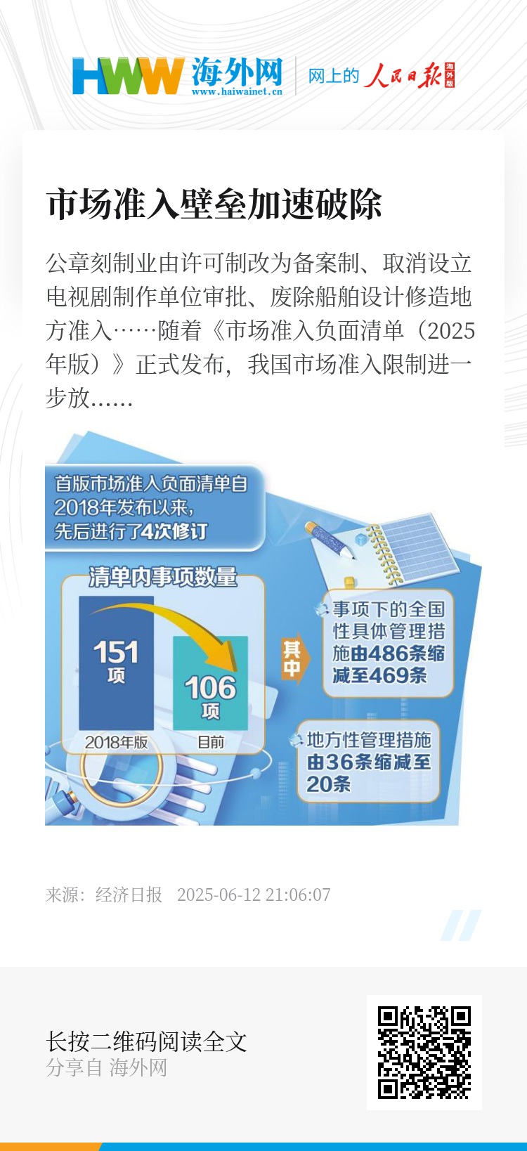 公章刻制业由许可制改为备案制、取消设立电视剧制作单位审批、废除船舶设计修造地方准入……随着《市场准入负面清单(2025年版)》正式发布,我国市场准入限制进一步放宽。