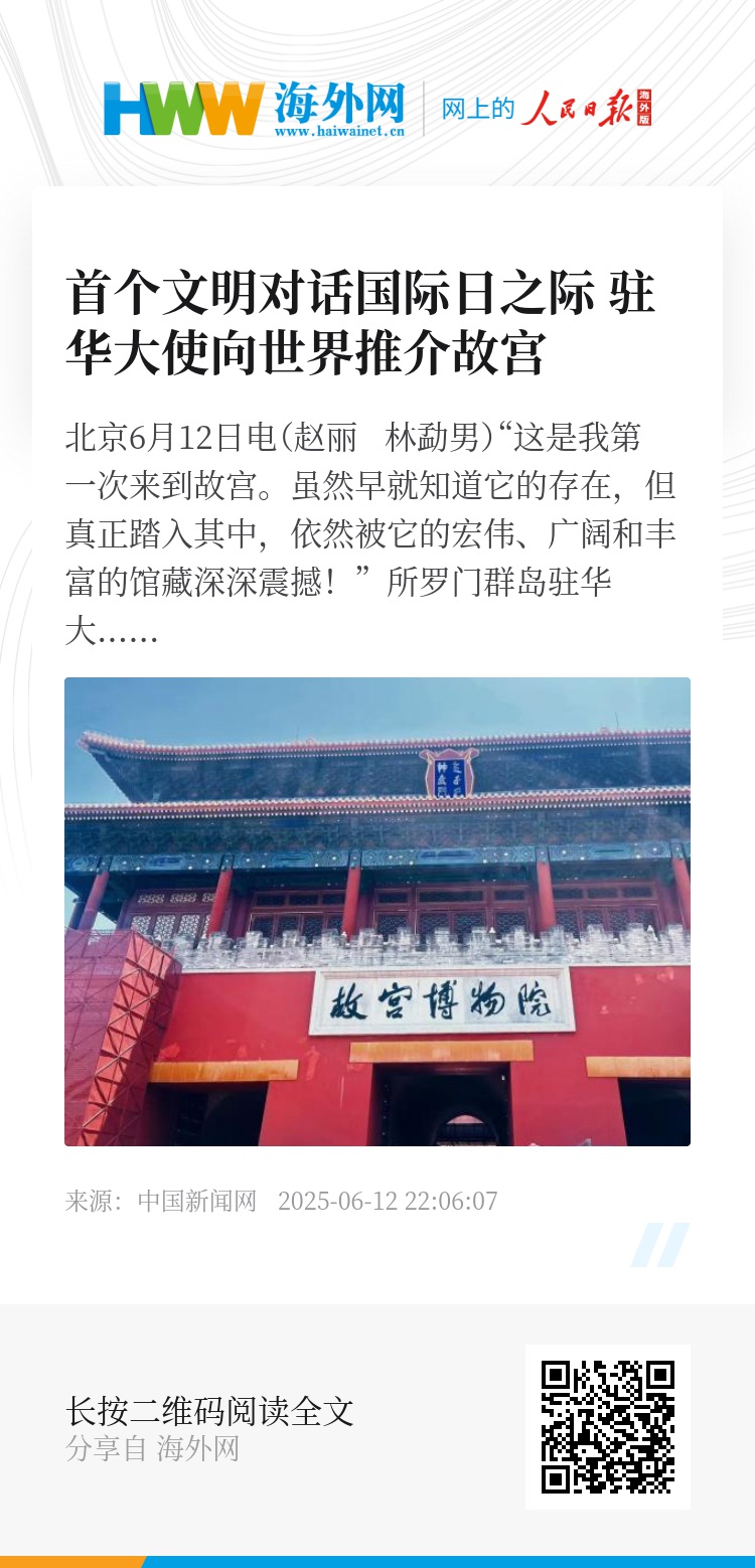 6月10日是首个文明对话国际日。当天,2025年“使节进故宫”活动在北京故宫博物院举行。来自克罗地亚、巴林、萨摩亚等30多个国家的驻华使节等40余人参加,感受中华优秀传统文化,共话文明交流互鉴。