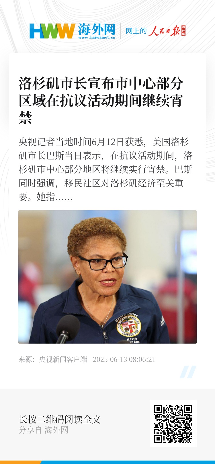 央视记者当地时间6月12日获悉,美国洛杉矶市长巴斯当日表示,在抗议活动期间,洛杉矶市中心部分地区将继续实行宵禁。