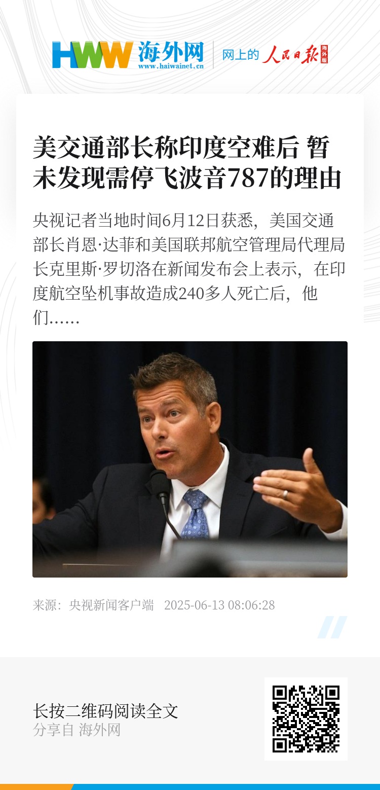 央视记者当地时间6月12日获悉,美国交通部长肖恩·达菲和美国联邦航空管理局代理局长克里斯·罗切洛在新闻发布会上表示,在印度航空坠机事故造成240多人死亡后,他们尚未看到任何需要停飞波音787航班的即时安全数据。