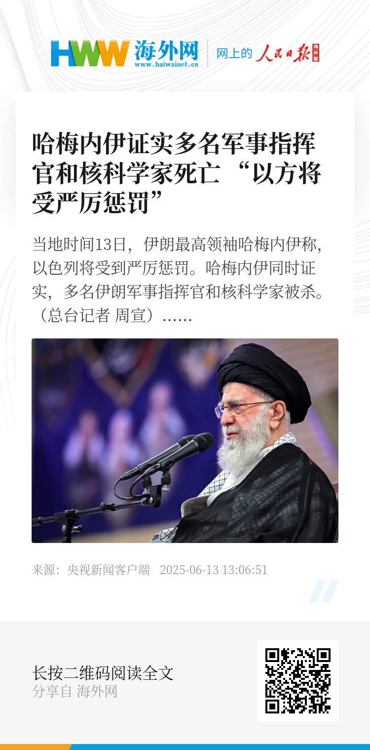 当地时间13日,伊朗最高领袖哈梅内伊称,以色列将受到严厉惩罚。哈梅内伊同时证实,多名伊朗军事指挥官和核科学家被杀。(总台记者 周宣)