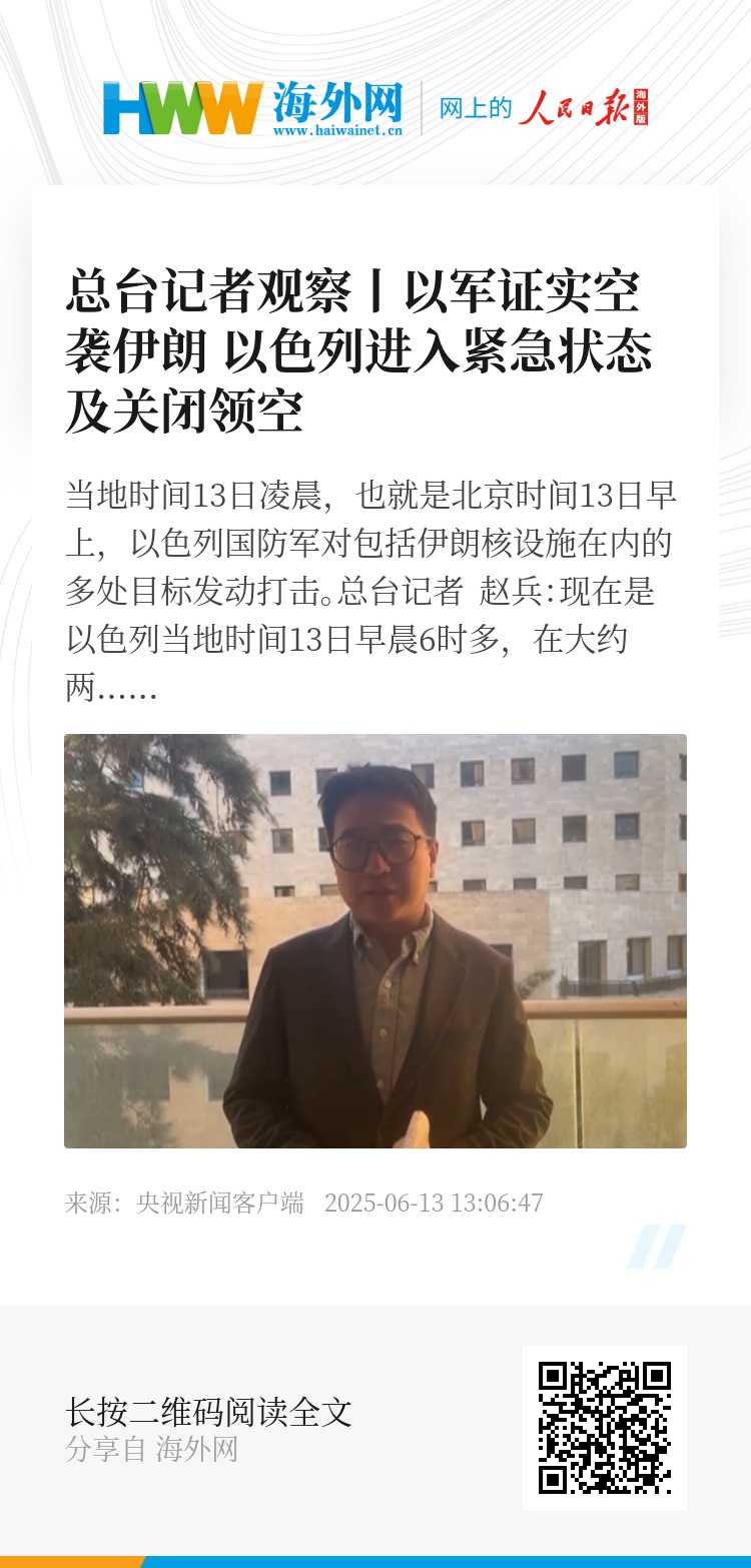 总台记者 赵兵:现在是以色列当地时间13日早晨6时多,在大约两个小时之前,以色列总理内塔尼亚胡发表了一个正式的视频讲话,证实以色列对伊朗发动了代号为“崛起的雄狮”空袭行动,称这是一项有针对性的军事行动,旨在消除所谓伊朗对以色列生存的威胁。他特别强调这项行动将持续数日,直到完全消除来自伊朗的威胁。