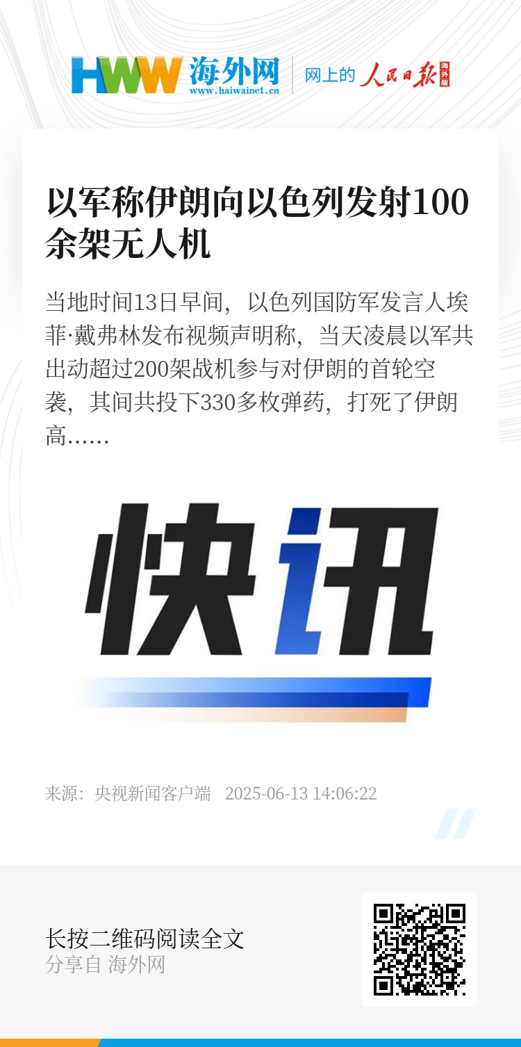 他同时称,过去几小时内,伊朗方面向以色列发射了100多架无人机,目前以军正在努力拦截这些无人机。(总台记者 王寅)