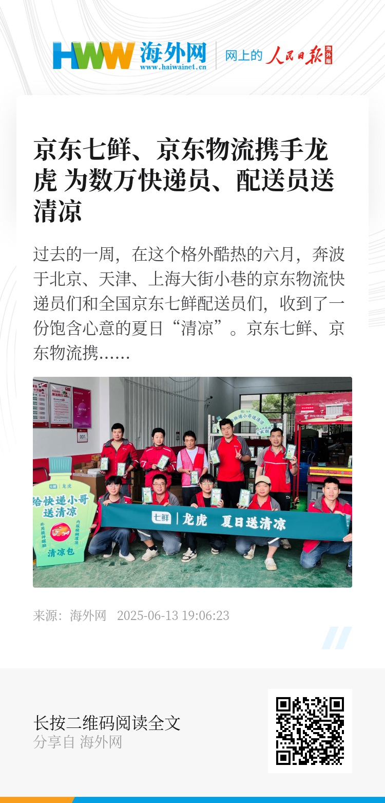 “快递员和配送员们是高温下不可或缺的力量,是连接千家万户幸福的纽带,他们的辛苦我们感同身受”,京东七鲜相关负责人表示,“这次在618高峰与高温叠加的特殊时期联合龙虎,不仅想为咱们快递与配送小哥们送上即时消暑的降温关怀,更希望用这些融合传统功效与趣味的创新产品,为他们在618期间加油打气。每一份清凉包,都是我们对这些平凡而伟大的城市守护者最深切的感谢!”