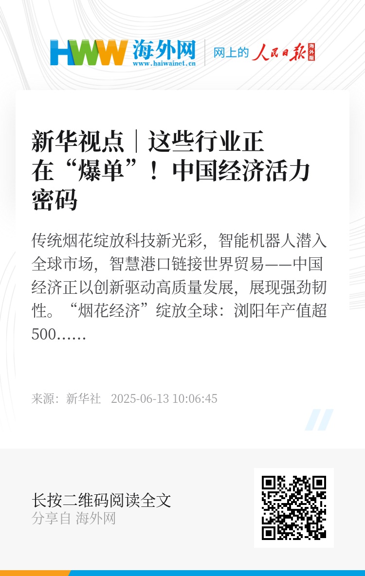 传统烟花绽放科技新光彩,智能机器人潜入全球市场,智慧港口链接世界贸易——中国经济正以创新驱动高质量发展,展现强劲韧性。