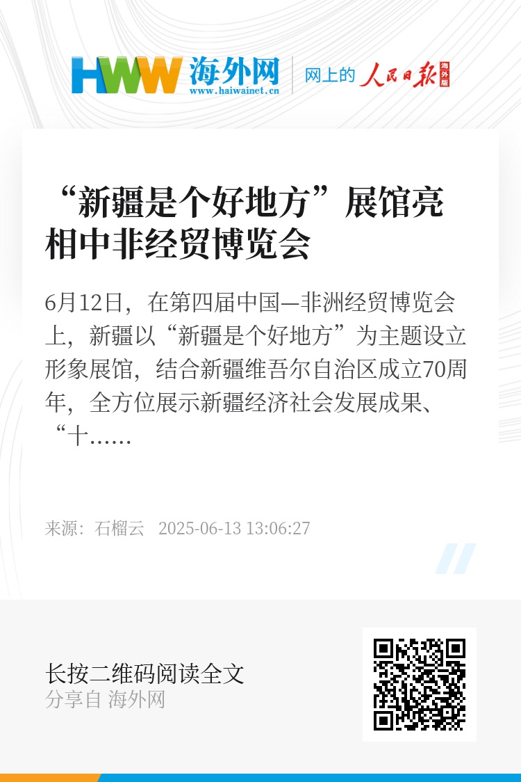 6月12日,在第四届中国—非洲经贸博览会上,新疆以“新疆是个好地方”为主题设立形象展馆,结合新疆维吾尔自治区成立70周年,全方位展示新疆经济社会发展成果、“十大产业集群”建设成果、中国(新疆)自由贸易试验区、对非洲经贸成果和重点对外合作项目等。