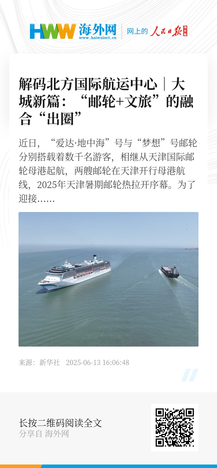 近日,“爱达·地中海”号与“梦想”号邮轮分别搭载着数千名游客,相继从天津国际邮轮母港起航,两艘邮轮在天津开行母港航线,2025年天津暑期邮轮热拉开序幕。