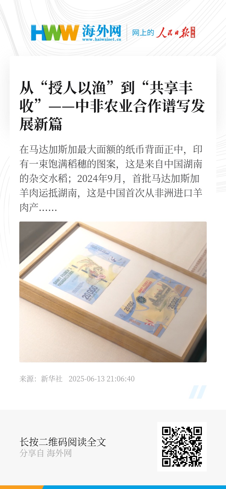 在马达加斯加最大面额的纸币背面正中,印有一束饱满稻穗的图案,这是来自中国湖南的杂交水稻;2024年9月,首批马达加斯加羊肉运抵湖南,这是中国首次从非洲进口羊肉产品;晨光熹微,肯尼亚海岸的渔民们在薄雾中将渔网撒向大海,所捕捞的野生鳀鱼加工成鱼干后将出口到中国,制成美味食品......