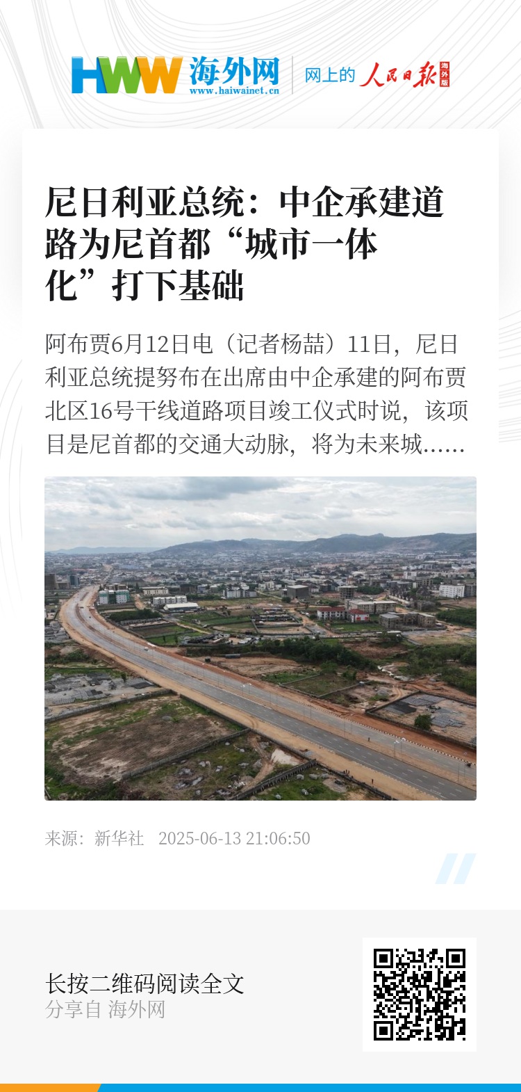 新华社阿布贾6月12日电(记者杨喆)11日,尼日利亚总统提努布在出席由中企承建的阿布贾北区16号干线道路项目竣工仪式时说,该项目是尼首都的交通大动脉,将为未来城市一体化打下基础。