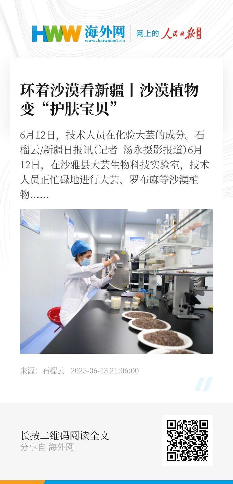石榴云/新疆日报讯(记者 汤永摄影报道)6月12日,在沙雅县大芸生物科技实验室,技术人员正忙碌地进行大芸、罗布麻等沙漠植物的过滤、萃取工作,致力于研发新一代护肤产品。该实验室配备高效液相层析色谱仪、精油提取设备等先进仪器,重点围绕胡杨碱、罗布麻、大芸、玫瑰等特色沙漠植物开展新技术研发。