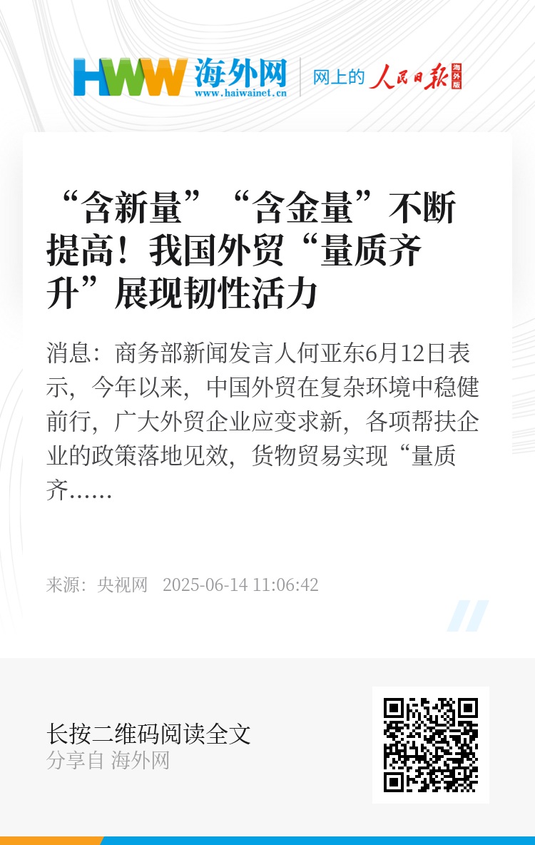央视网消息:商务部新闻发言人何亚东6月12日表示,今年以来,中国外贸在复杂环境中稳健前行,广大外贸企业应变求新,各项帮扶企业的政策落地见效,货物贸易实现“量质齐升”,展现出中国外贸独特的韧性和活力。