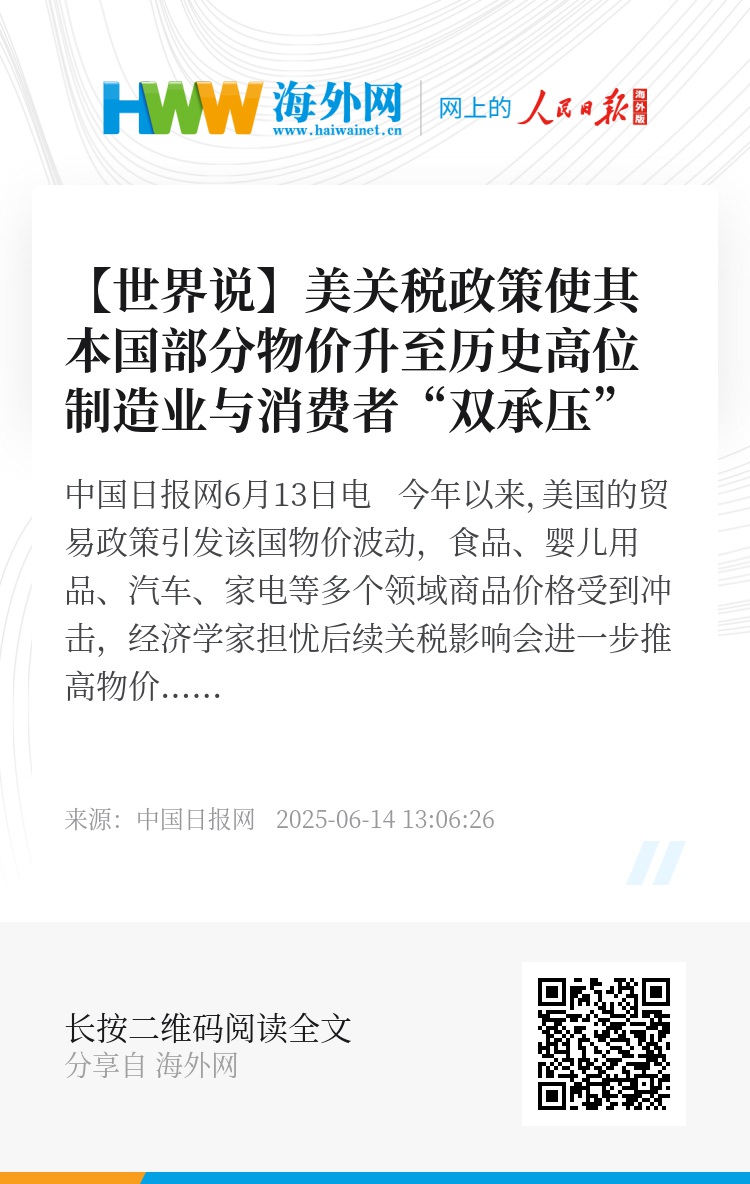 中国日报网6月13日电 今年以来,美国的贸易政策引发该国物价波动,食品、婴儿用品、汽车、家电等多个领域商品价格受到冲击,经济学家担忧后续关税影响会进一步推高物价。