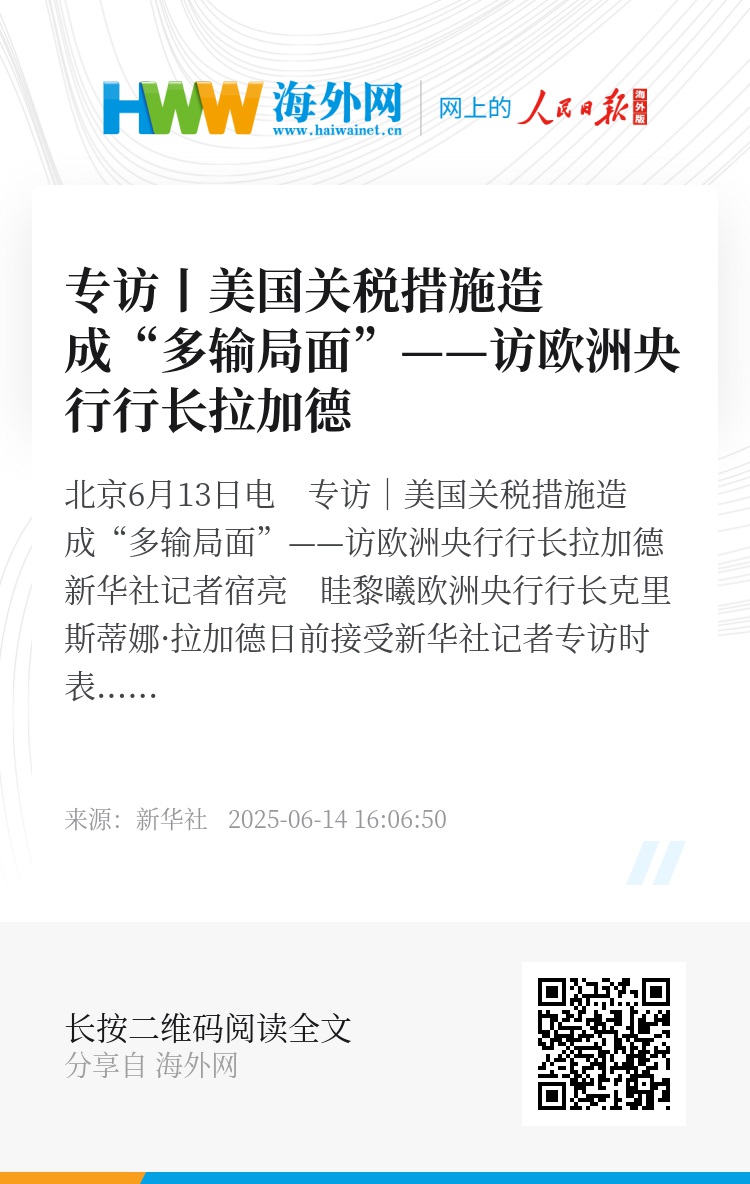 新华社北京6月13日电 专访|美国关税措施造成“多输局面”——访欧洲央行行长拉加德