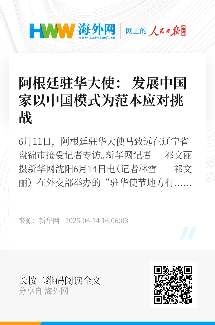 新华网沈阳6月14日电(记者林雪 祁文丽)在外交部举办的“驻华使节地方行”活动期间,阿根廷驻华大使马致远接受新华网记者专访时表示,包括阿根廷在内的广大发展中国家以中国模式为范本应对经济发展过程中遇到的挑战。