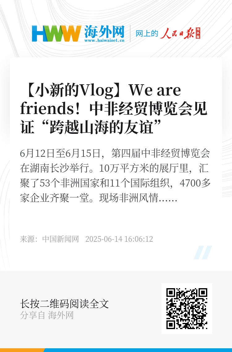 6月12日至6月15日,第四届中非经贸博览会在湖南长沙举行。10万平方米的展厅里,汇聚了53个非洲国家和11个国际组织,4700多家企业齐聚一堂。现场非洲风情扑面而来,南非红酒、肯尼亚坚果、纳米比亚辣椒酱……让人眼前一亮!从公路到大楼,从支付到金融,中非合作的成果随处可见,处处彰显着双方的深厚情谊。(尹柳清 徐志雄 长沙报道)