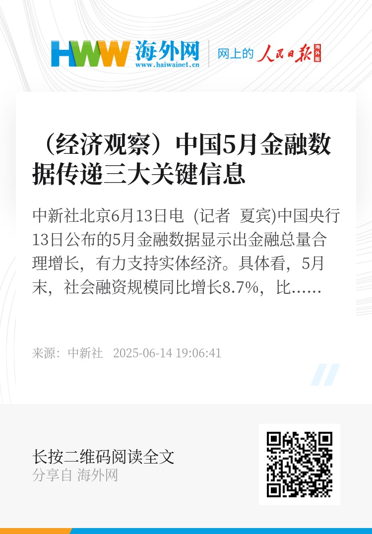 中新社北京6月13日电 (记者 夏宾)中国央行13日公布的5月金融数据显示出金融总量合理增长,有力支持实体经济。
