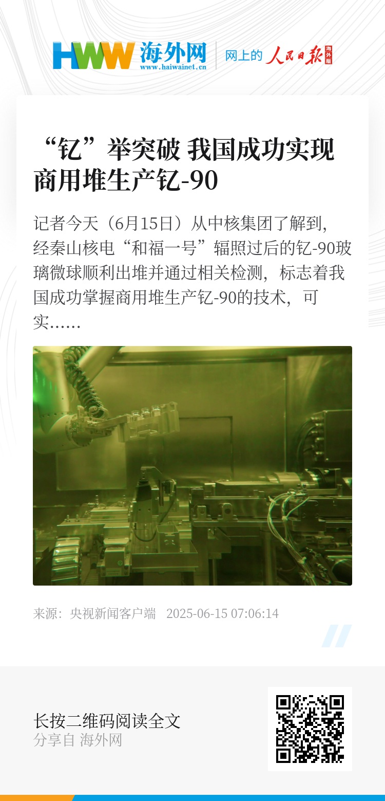 记者今天(6月15日)从中核集团了解到,经秦山核电“和福一号”辐照过后的钇-90玻璃微球顺利出堆并通过相关检测,标志着我国成功掌握商用堆生产钇-90的技术,可实现批量化生产。