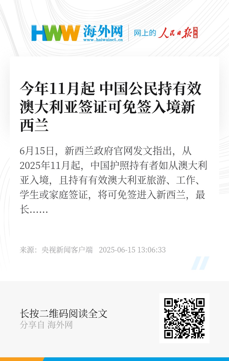 6月15日,新西兰政府官网发文指出,从2025年11月起,中国护照持有者如从澳大利亚入境,且持有有效澳大利亚旅游、工作、学生或家庭签证,将可免签进入新西兰,最长停留3个月。(总台记者 刘志敏)