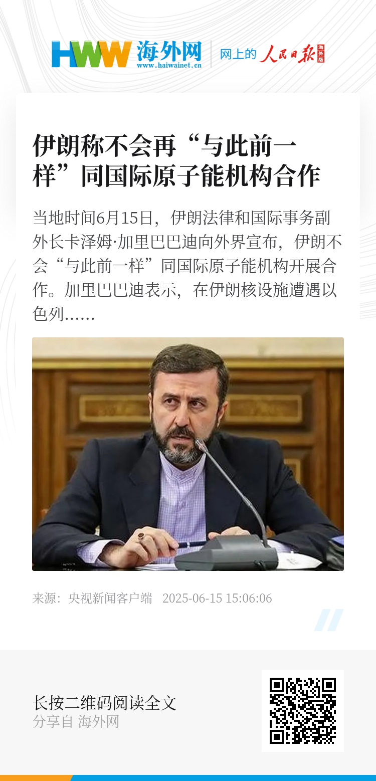 当地时间6月15日,伊朗法律和国际事务副外长卡泽姆·加里巴巴迪向外界宣布,伊朗不会“与此前一样”同国际原子能机构开展合作。