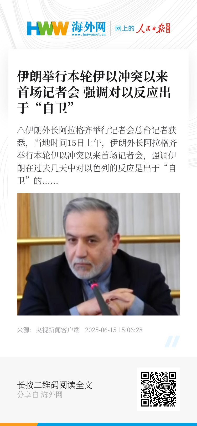 总台记者获悉,当地时间15日上午,伊朗外长阿拉格齐举行本轮伊以冲突以来首场记者会,强调伊朗在过去几天中对以色列的反应是出于“自卫”的需要,并且符合国际法的规定。