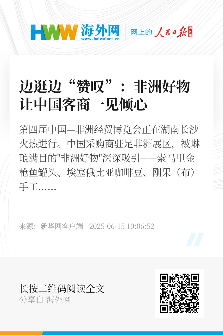 第四届中国—非洲经贸博览会正在湖南长沙火热进行。中国采购商驻足非洲展区,被琳琅满目的"非洲好物"深深吸引——索马里金枪鱼罐头、埃塞俄比亚咖啡豆、刚果(布)手工艺品,无不展现着非洲特色产业的创新活力。这些承载文化底蕴与市场潜力的优质商品,正成为中非商贸合作的新机遇。博览会不仅搭建了高效采购平台,更通过产品展示、产业对接等活动,进一步推动中非经贸合作。