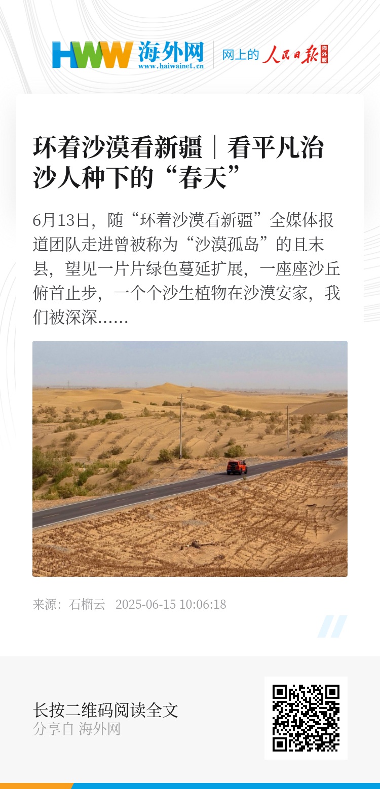 6月13日,随“环着沙漠看新疆”全媒体报道团队走进曾被称为“沙漠孤岛”的且末县,望见一片片绿色蔓延扩展,一座座沙丘俯首止步,一个个沙生植物在沙漠安家,我们被深深震撼了。