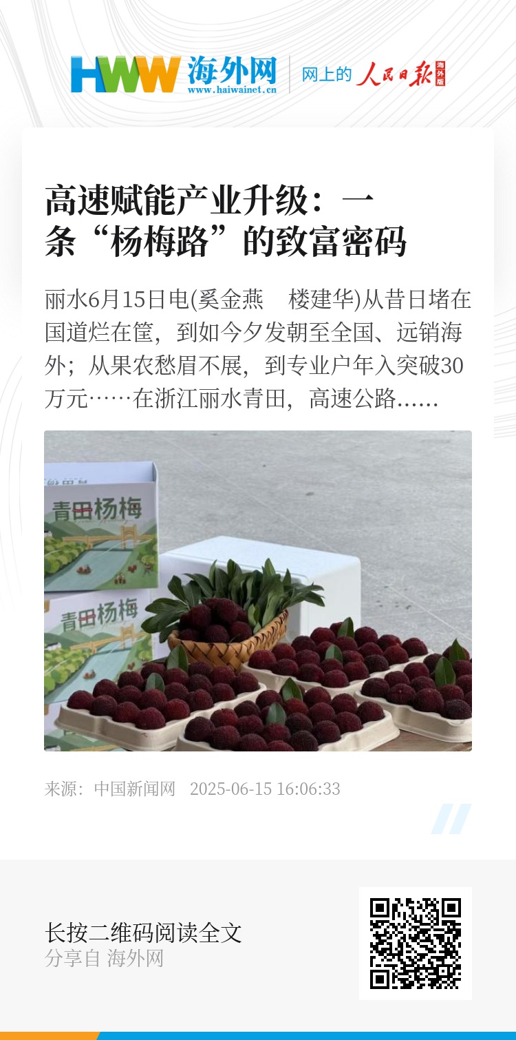 一条高速路,让青田杨梅完成了从“山货”到“尖货”的华丽蜕变。这“致富密码”的终极体现,不仅是收入的倍增,更是品质的飞跃、品牌的崛起与产业链的韧性提升。如今,高速就像一条金色的纽带,将青田杨梅与全国乃至世界紧密相连,这条金色纽带所承载的远不止甘甜的果实,更是山区特色农业突破地域限制、实现高质量发展的希望之路。