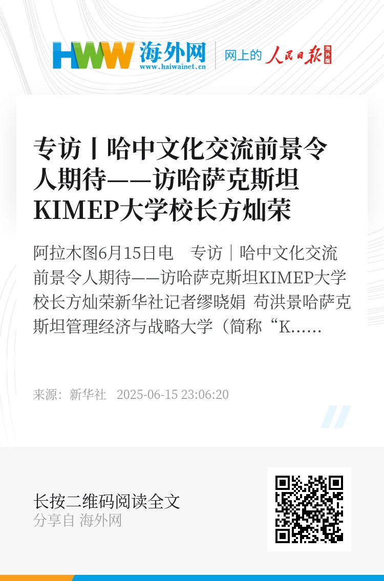新华社阿拉木图6月15日电 专访|哈中文化交流前景令人期待——访哈萨克斯坦KIMEP大学校长方灿荣