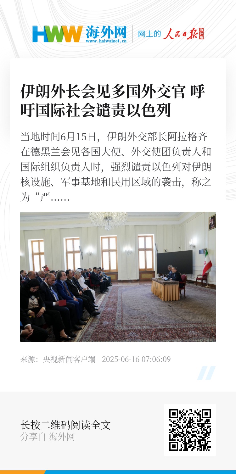 当地时间6月15日,伊朗外交部长阿拉格齐在德黑兰会见各国大使、外交使团负责人和国际组织负责人时,强烈谴责以色列对伊朗核设施、军事基地和民用区域的袭击,称之为“严重违反国际法”的侵略行为,威胁全球和平。