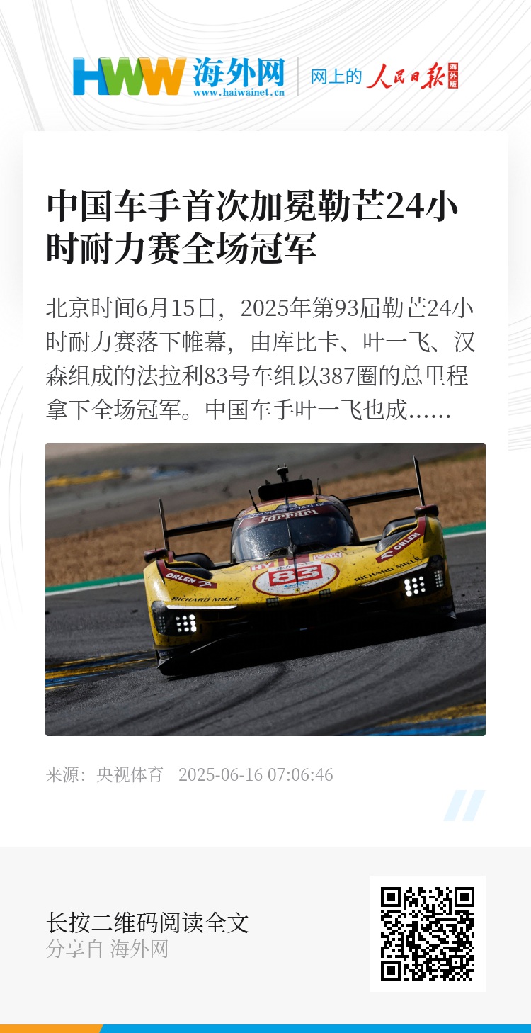 北京时间6月15日,2025年第93届勒芒24小时耐力赛落下帷幕,由库比卡、叶一飞、汉森组成的法拉利83号车组以387圈的总里程拿下全场冠军。中国车手叶一飞也成为首位加冕勒芒24小时全场冠军的中国车手。法拉利实现2023-2025的勒芒三连冠伟业。