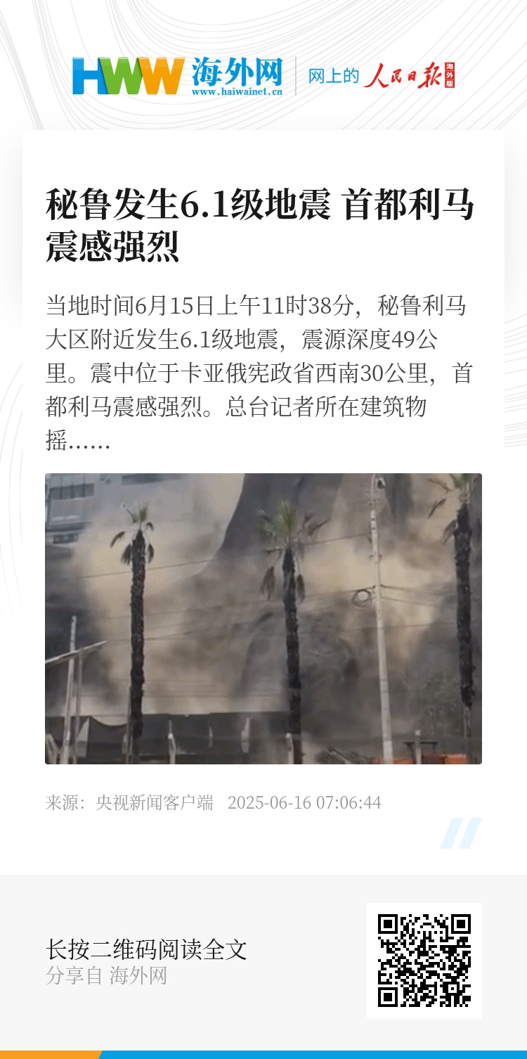 当地时间6月15日上午11时38分,秘鲁利马大区附近发生6.1级地震,震源深度49公里。震中位于卡亚俄宪政省西南30公里,首都利马震感强烈。总台记者所在建筑物摇晃5秒左右。目前暂无人员伤亡报告。