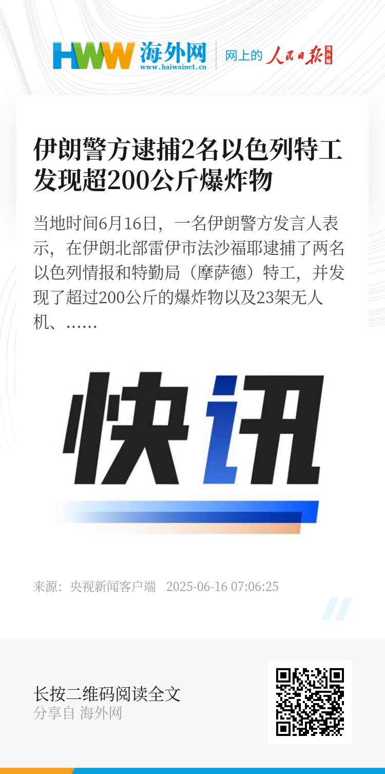 当地时间6月16日,一名伊朗警方发言人表示,在伊朗北部雷伊市法沙福耶逮捕了两名以色列情报和特勤局(摩萨德)特工,并发现了超过200公斤的爆炸物以及23架无人机、发射器、制导装置、控制器和一辆运载车。(总台记者 张卓雅)