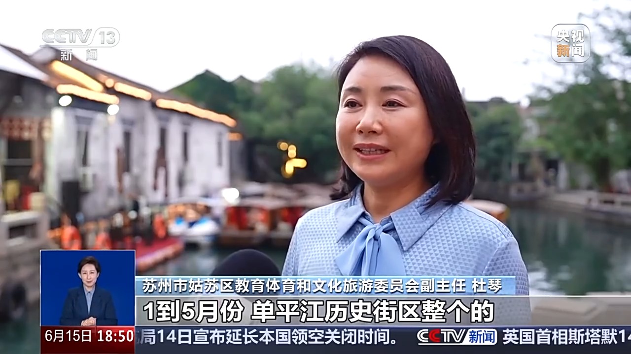 苏州市姑苏区教育体育和文化旅游委员会副主任 杜琴:1~5月份,单平江历史街区整个的旅游接待量达到了1300万人次,同比也增加了18.9%,也带动了其他的一些产业链,吸引更多的年轻人来古城旅游打卡。