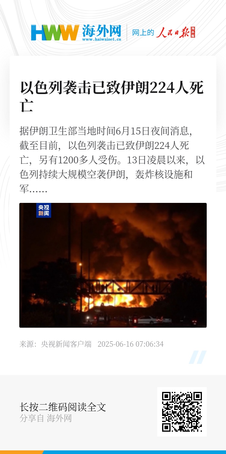 据伊朗卫生部当地时间6月15日夜间消息,截至目前,以色列袭击已致伊朗224人死亡,另有1200多人受伤。