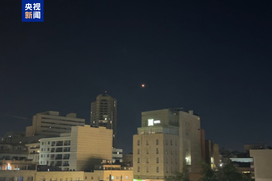 总台记者拍摄的画面显示,导弹飞速地从夜空划过,以色列防空系统的防空导弹从地面升空去拦截来袭的导弹。(总台记者 赵兵)