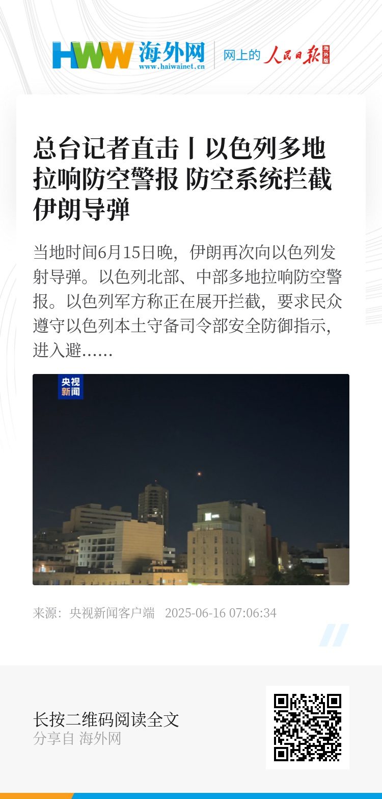 当地时间6月15日晚,伊朗再次向以色列发射导弹。以色列北部、中部多地拉响防空警报。以色列军方称正在展开拦截,要求民众遵守以色列本土守备司令部安全防御指示,进入避难所。
