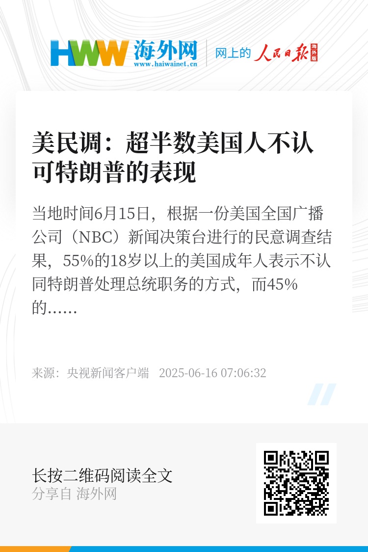 当地时间6月15日,根据一份美国全国广播公司(NBC)新闻决策台进行的民意调查结果,55%的18岁以上的美国成年人表示不认同特朗普处理总统职务的方式,而45%的人表示赞成,这一数字与NBC在4月份进行的一份民意调查结果相似。