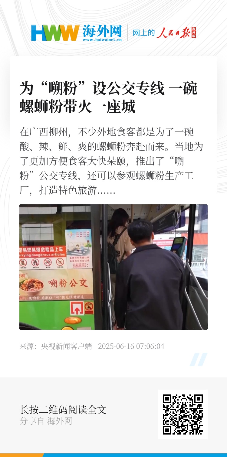 总台记者 张卉:如果您是第一次来到柳州,又不知道去哪里吃美味的螺蛳粉,那就可以选择乘坐当地推出的“嗍粉”公交车。您瞧在我身边的站台标示牌上,清楚地标明了一些当地有名的螺蛳粉店。